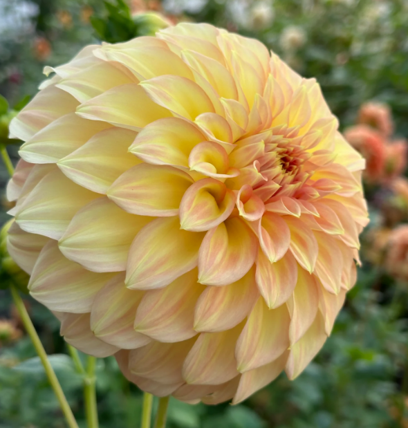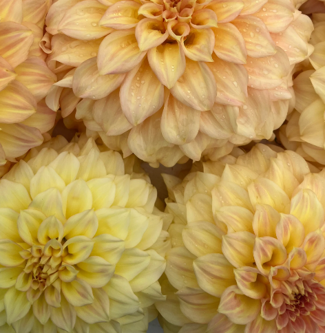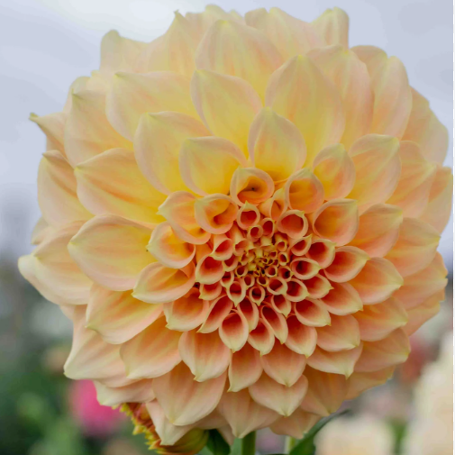 It has the most lovely feminine quality, creamy peaches and soft pinks that blend in a beautiful correlation. Used highly in wedding floral design and its a color bridge dahlia that makes it easy to use with solid colors existing within its varied colored range.