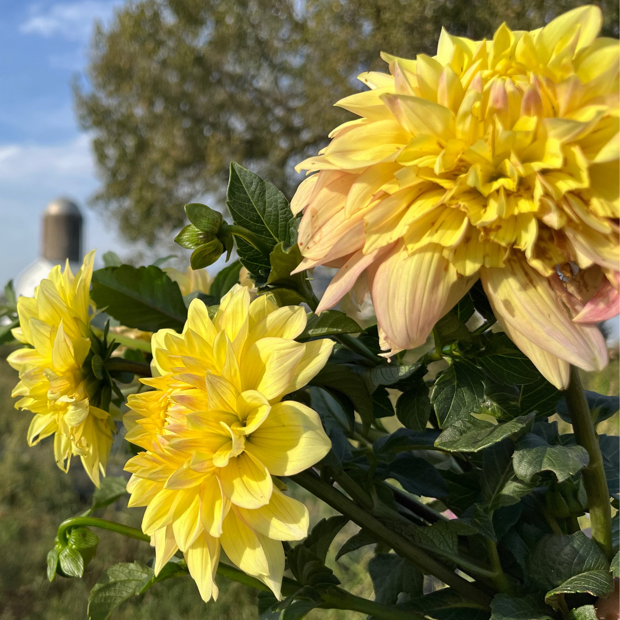 Farmer Meredith is a fan of dahlias like Miss Amara, as the decorative size is just above a ball dahlia and less than a small dinner plate. Another color shifter dahlia, ranging from golden yellow touched to rays of salmon pink. It seems that outdoor growing alters its color forms. Colder temps seem to produce shades of butter yellow, while hot sun exposure brings out this orange salmon pink colors. Warm tones are this dahlia's foundation.